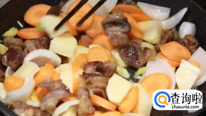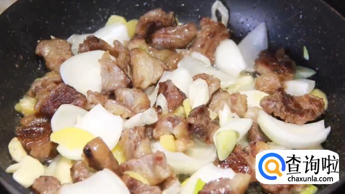 接着,另起一锅,待锅烧热之后放入牛腩煸油。出油后,再加入生姜、大蒜、大葱、洋葱,用筷子轻轻翻动混合几下。