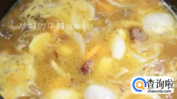 另起一锅,加入适量清水,烧热之后放入咖喱,不断用筷子进行搅拌。待咖喱完全融化之后,将炒好的牛腩和配菜一起放入咖喱中炖煮30分钟。