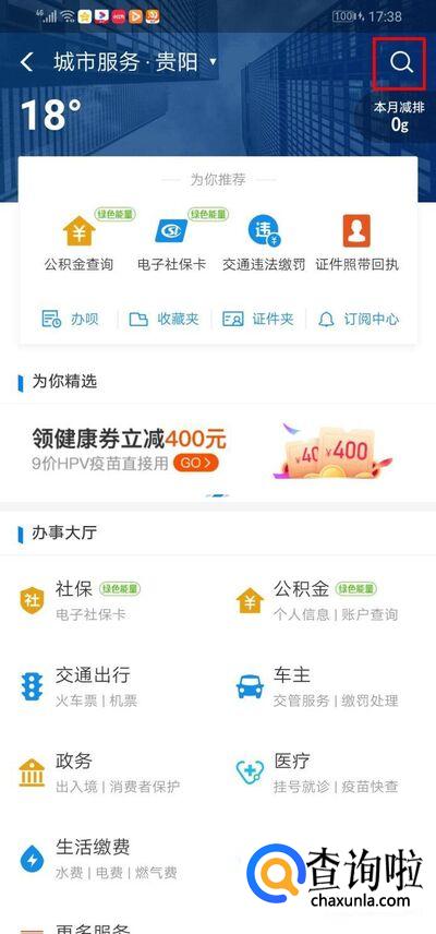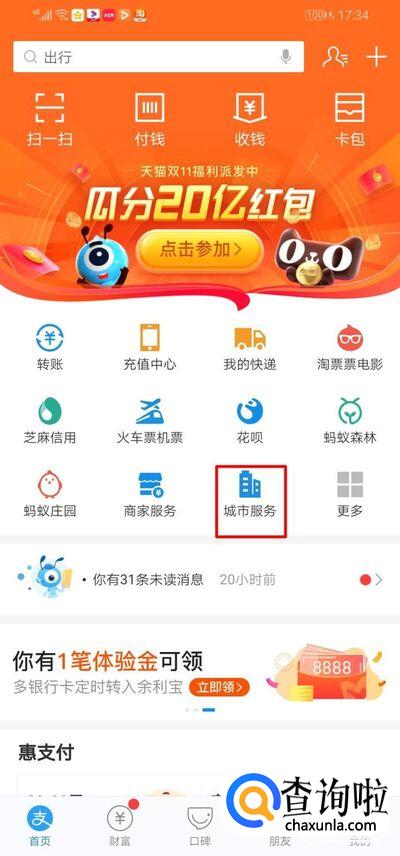 打开手机支付宝,在首页中点击城市服务。若找不到,则点击更多,里面找到“城市服务”。