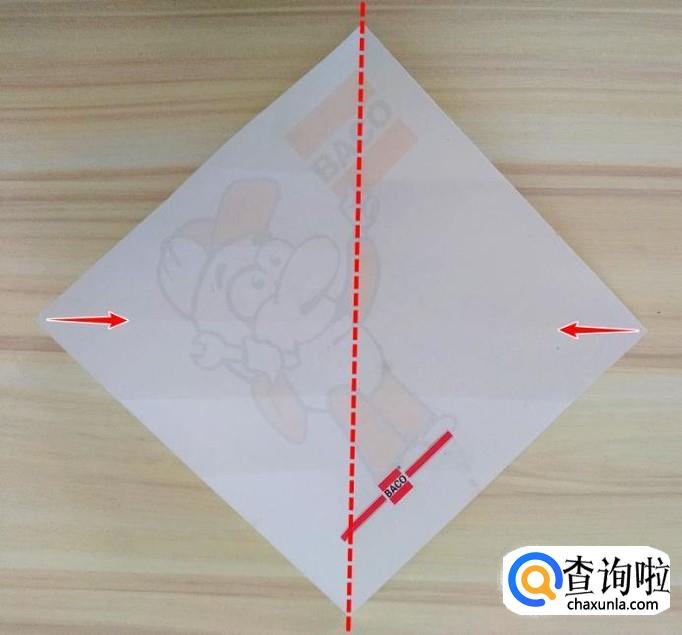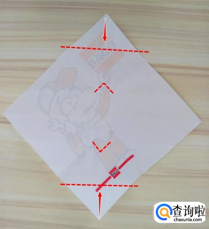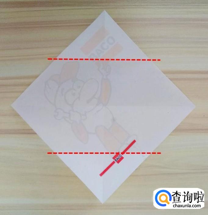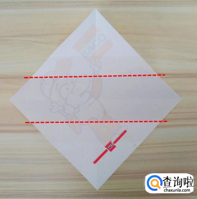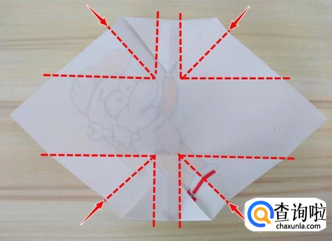 再将外面的尖角沿着虚线向里折叠,包包的一边就折好了;