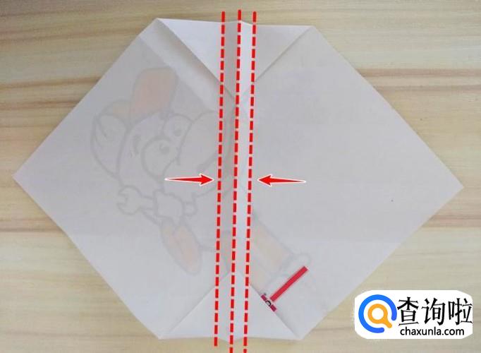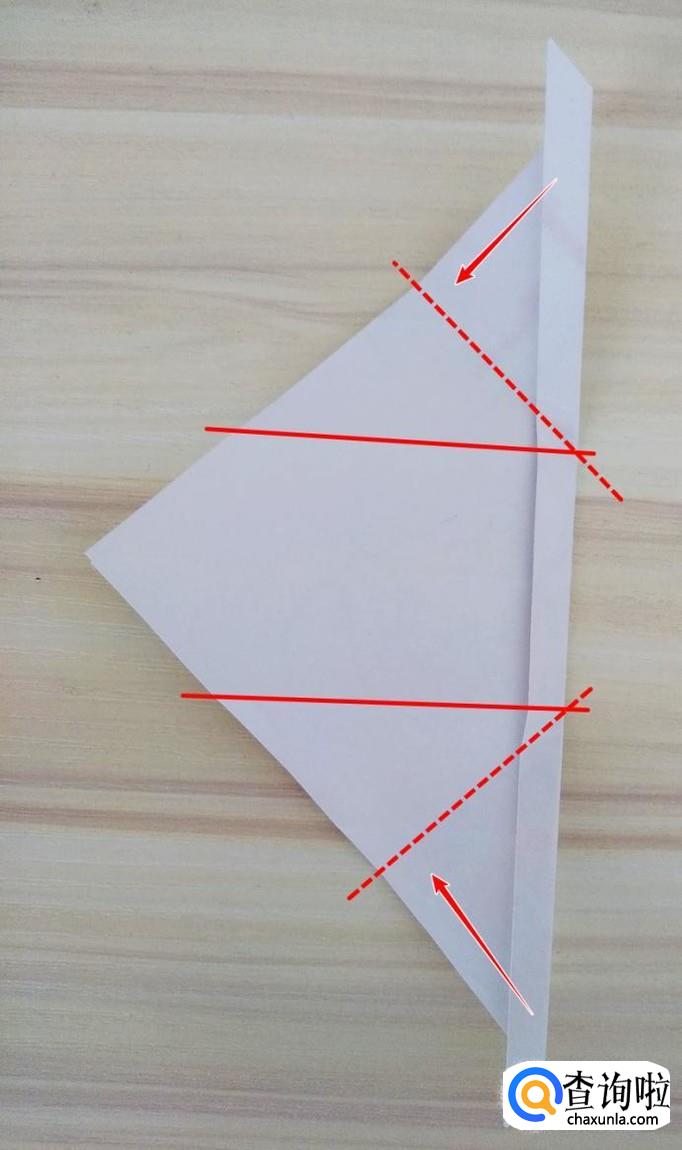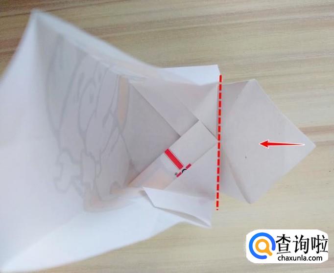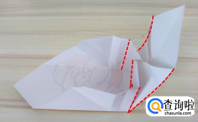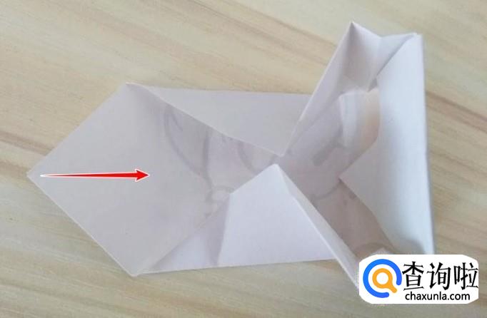 根据图示,将箭头的折痕位置向上提,同时将箭头两边的垂直折痕捏着合在一起,可以先弄右边的两个,折好的样子如图;