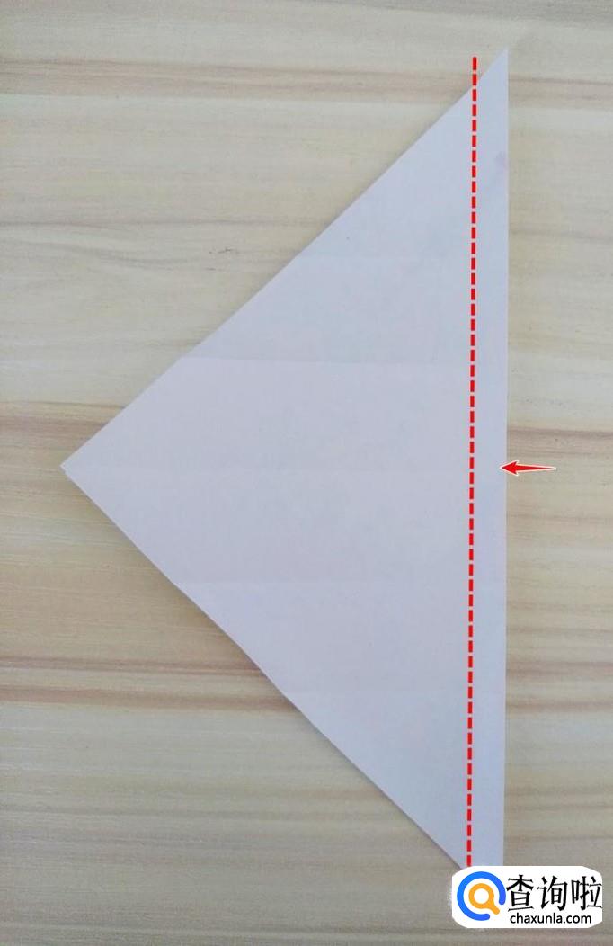 沿着虚线,即和刚刚的折痕垂直的对角线对折,形成一个三角形;