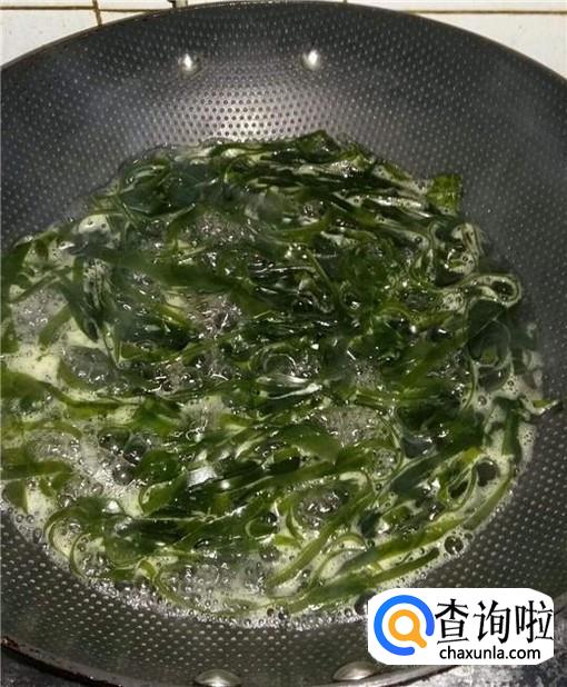 然后将干海藻倒入沸水中,稍微焯烫两分钟,这样可以有效去除干海藻表面和内部的灰尘杂质。