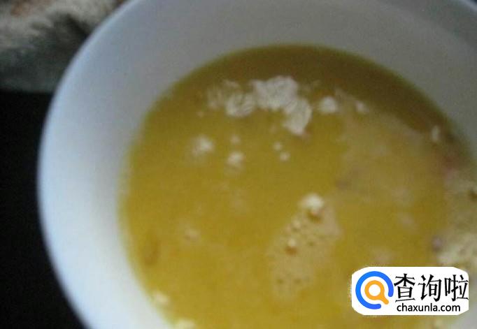 把鸡蛋打入碗中,加入一两滴水,打散,打出泡沫即可