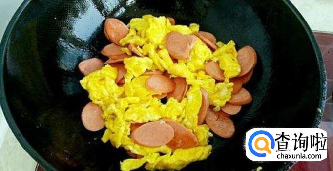 加入香肠片,炒制一会儿,加入适量的食用盐,香料,炒制有香味即可出锅