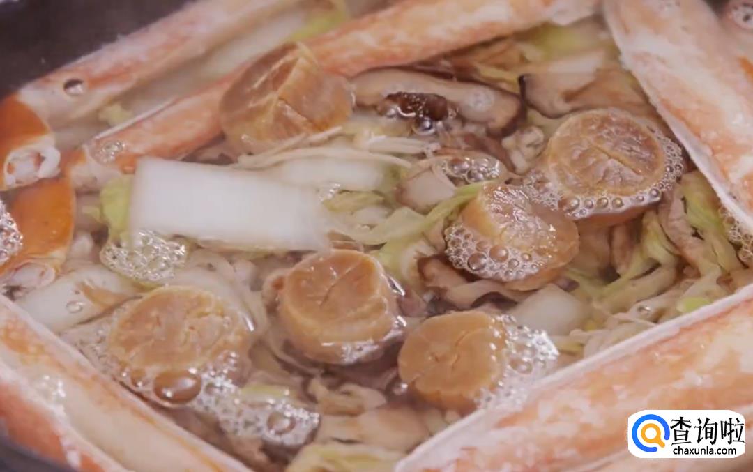 然后将所有材料放入砂锅,再摆上蟹腿肉和干贝,倒入热水,大火烧开后转小火,盖上锅盖炖煮30分钟。