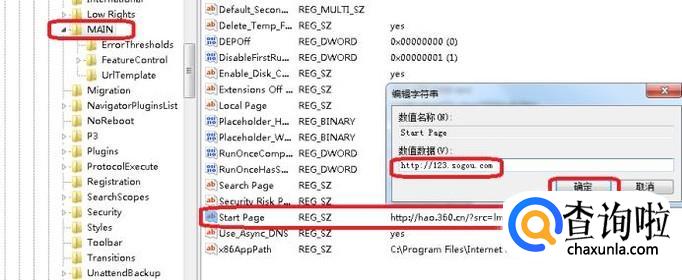 在注册表路径中,依次展开HKEY_LOCAL_MACHINESOFTWAREMicrosoftInternetExplorerMain ,如图所示,在右侧找到“start page”,双击该项目,弹出“编辑字符串”选项框,把数值数据修改成想要的网址就可以了。