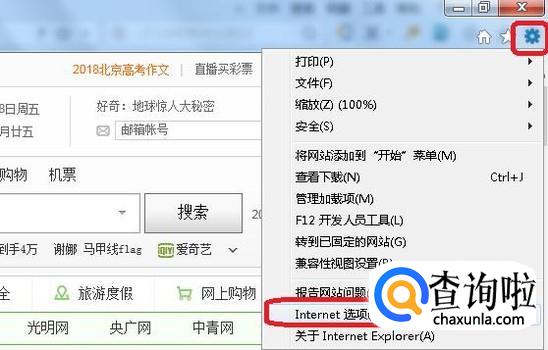 第一种方法,打开浏览器,如图所示,找到浏览器的“设置”按钮,在下级菜单中调出“internet选项”。