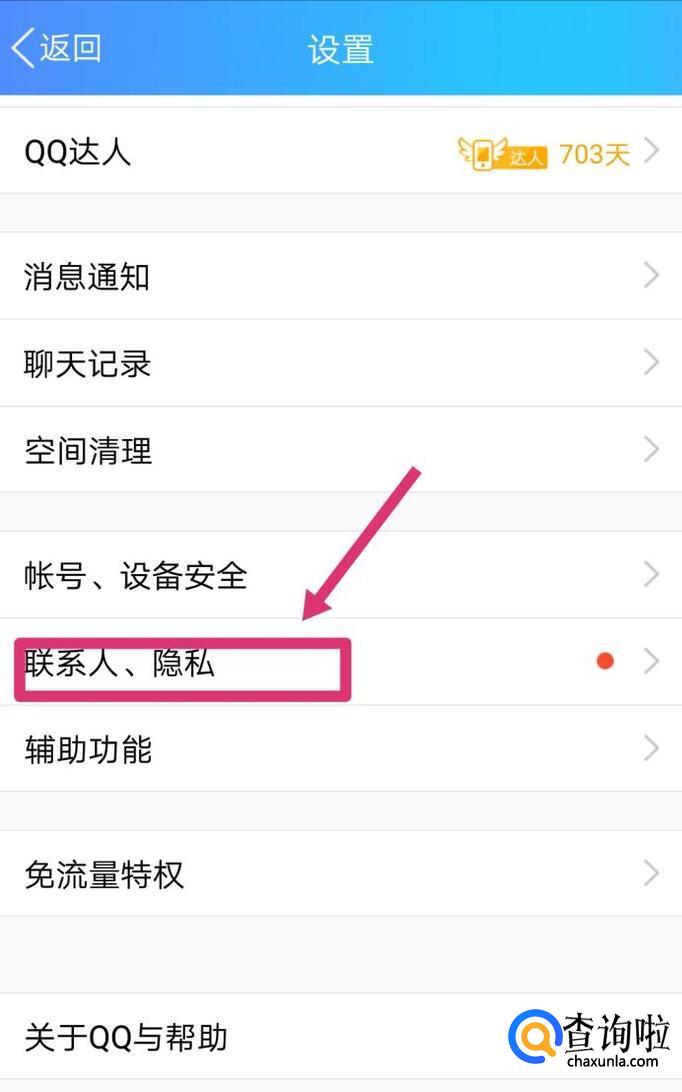 打开设置后,在中间部位会出现“联系人,隐私”的选择,将其打开,如下图。