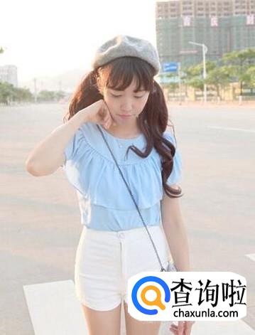 白色短裤搭配宽圆领短上衣,显得特别小巧可爱,加上天蓝色的冷色调,显得特别凉爽、透亮。