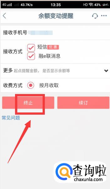 进入后,就是【余额变动提醒】的页面了,在下方有个【终止】的字样,点击即可。