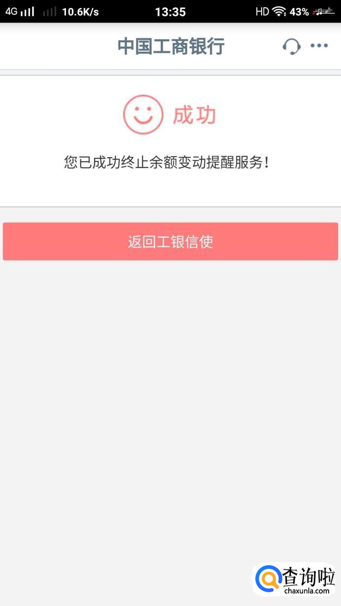 点击【终止】后,系统就会弹出【您已成功终止余额变动提醒服务】的字样了。点击【返回工行信使】即可。