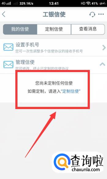 返回到【工行信使】的页面后,在空白处就显示着【您尚未定制任何信使】的字样啦,这就说明是取消成功了。