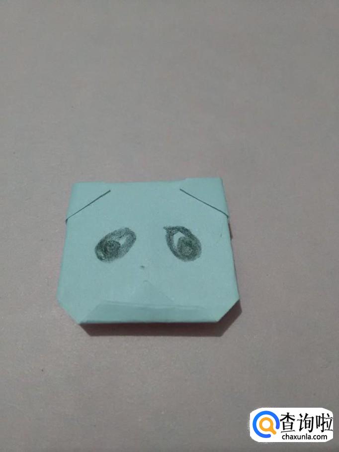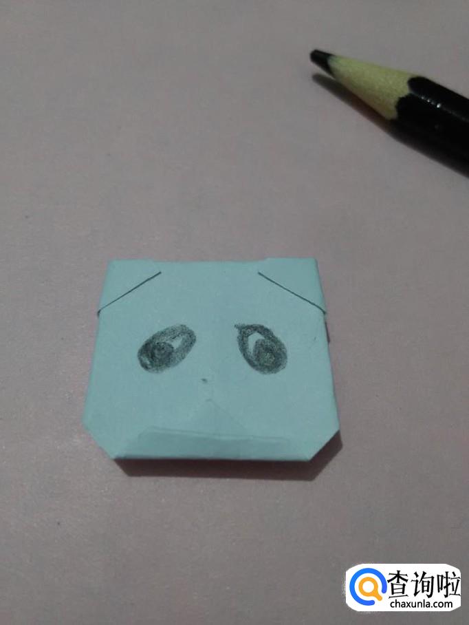 用黑笔在熊猫脸上画两个椭圆形,表示眼睛,在眼睛里画两个黑点,表示眼珠,熊猫头就折完了。