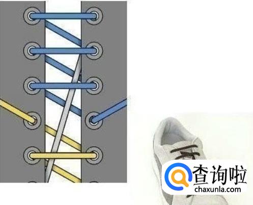 先将两根鞋带固定到两点,一根用于斜边上去,一根鞋带用于横条,注意斜边一定要一个鞋带扣,这样出来的效果才会好看。