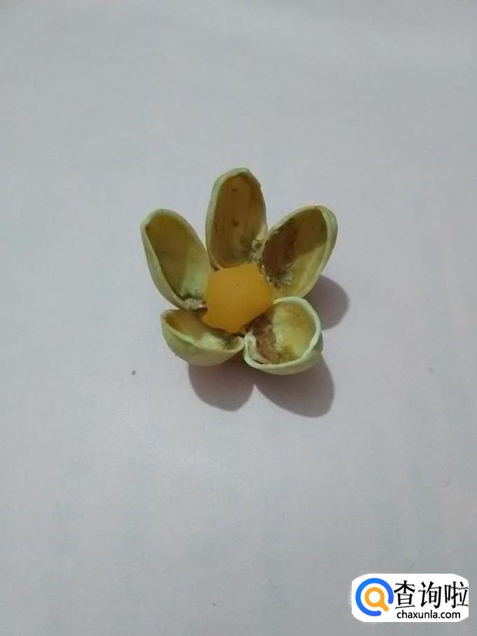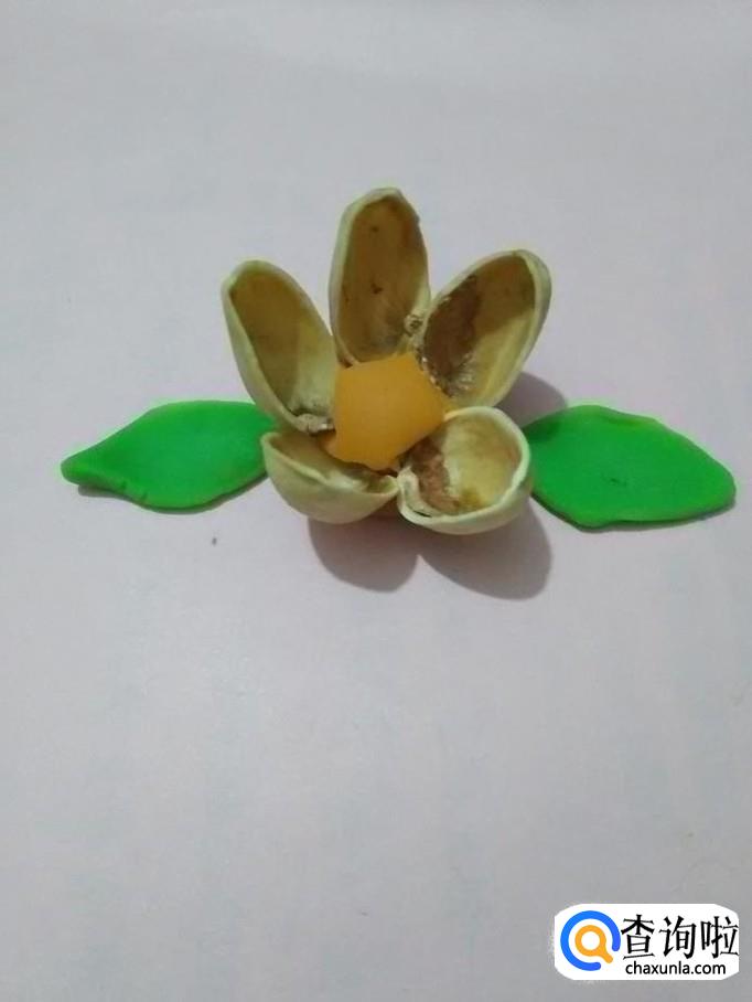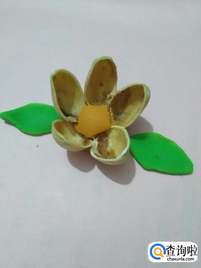 将五个开心果壳均匀地插在桔色彩泥上面,中间露出的彩泥正好当作花芯。