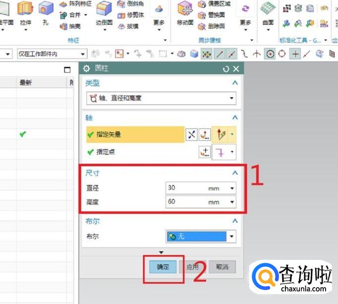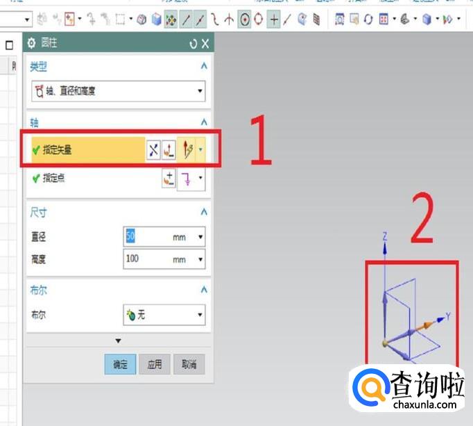 类型、轴都设置好了,接下来设置尺寸,我们知道圆柱就两个关键尺寸,一个是直径,一个是高度,直径决定这圆柱的粗细,高度决定着圆柱的长短。系统默认的是尺寸是直径50高度100,为了方便演示,笔者改一下直径30高度60(见下图1号红色框选)。