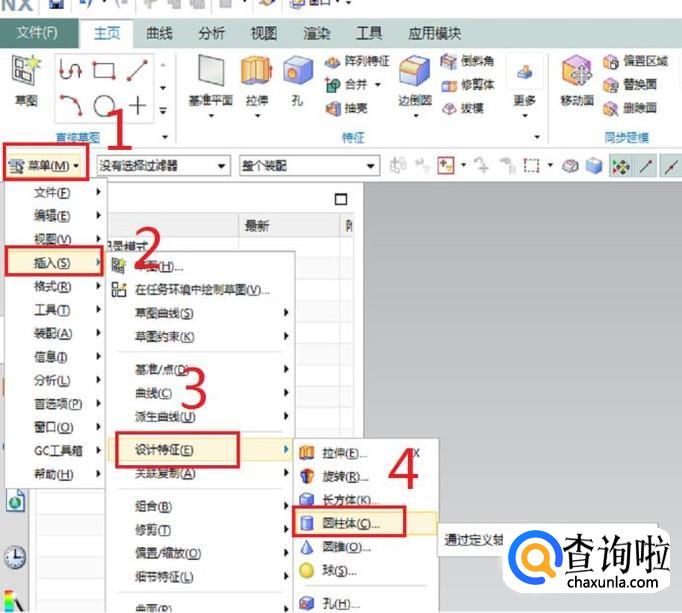 执行【菜单】【插入】【设计特征】【圆柱体】(还不懂的可以看下图红色框选,笔者都标注了序号1、2、3、4)
