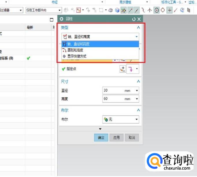 激活“圆柱体”命令,会弹出下图所示的“圆柱”对话框。对于初次使用这个方法插入圆柱体的同学们,一定要仔细看明白对话框中的信息,它会告诉我们操作顺序、操作内容:类型、轴、尺寸都是必须设置的。
