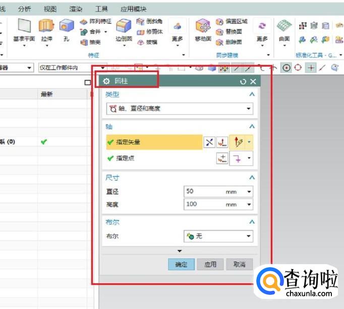 相信细心的同学们应该注意到“圆柱”对话框中还有“布尔”没有设置,因为这里只有单个的圆柱体,无法进行布尔求和,更不能进行布尔求差,所以笔者没去管它。记住,想要用布尔,必须有两个实体才行。