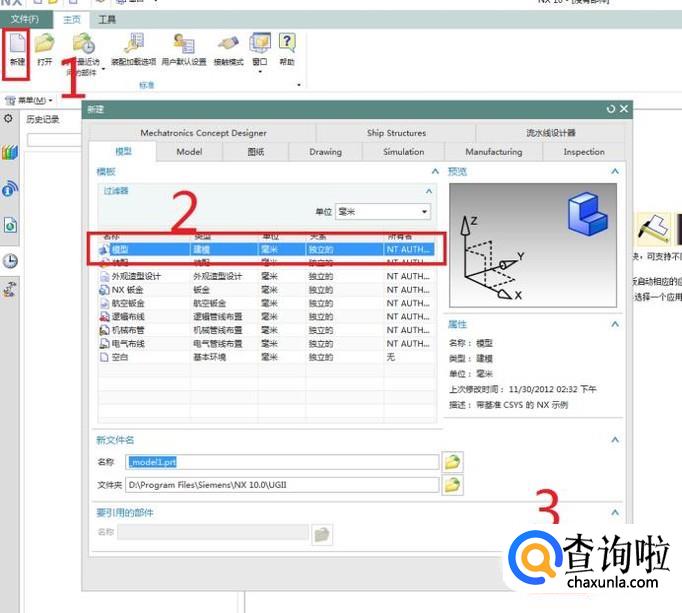 打开UG10.0软件,新建一个模型文件。具体步骤见下图红色框选1、2、3。