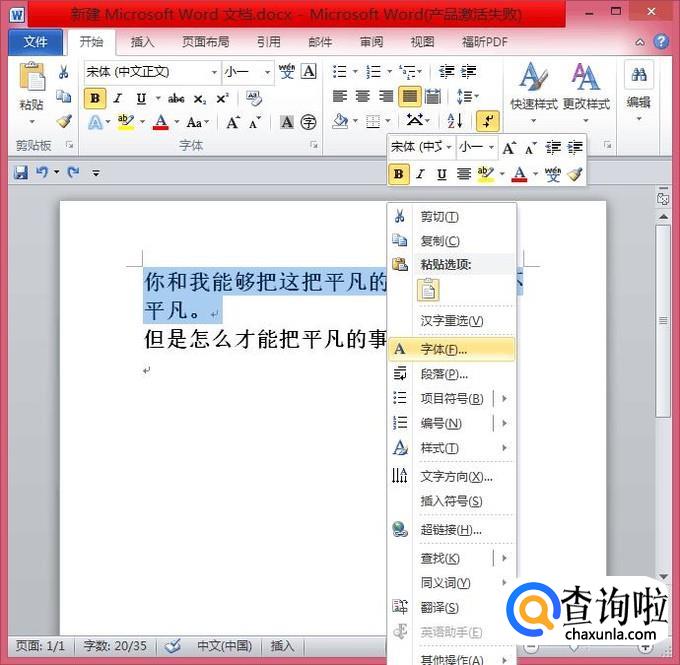 撤销前面的操作,让它回到最初!然后再次选择那一段文字,单击右键,选择“字体”