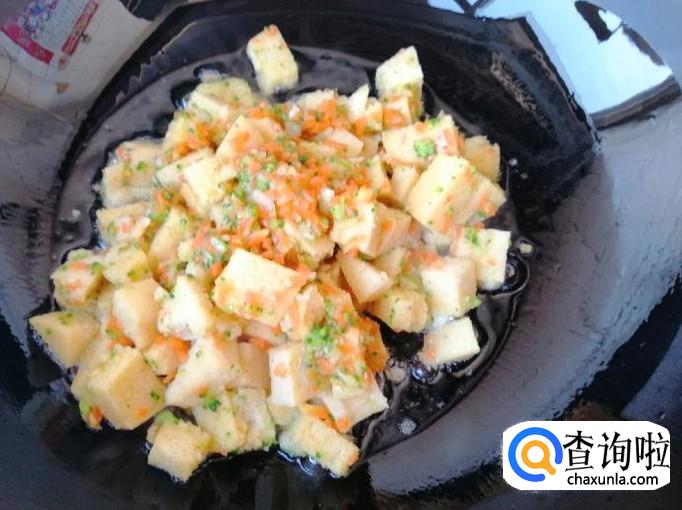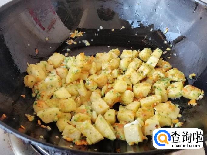 炒锅放油油热后,把调好的馒头丁菜蛋液倒入锅中,用铲子快速翻炒均匀,注意火不要太大,翻炒至如图所示就可以了,这样好看好吃的剩馒头就做好了,出锅入盘就可以享受美味了,大人小孩都喜欢,如果你也喜欢别忘了点赞哦!