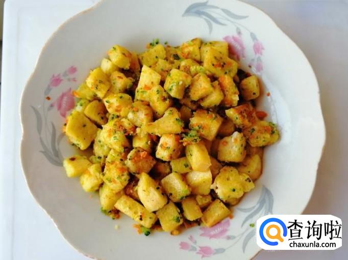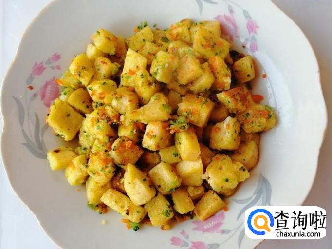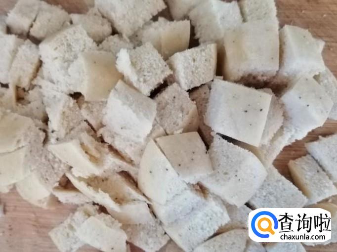 取一个剩馒头,用刀把馒头切成如图所示的馒头丁,不要切太大,我这里是家里剩的杂粮馒头,把馒头切丁待用。