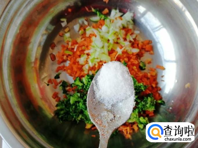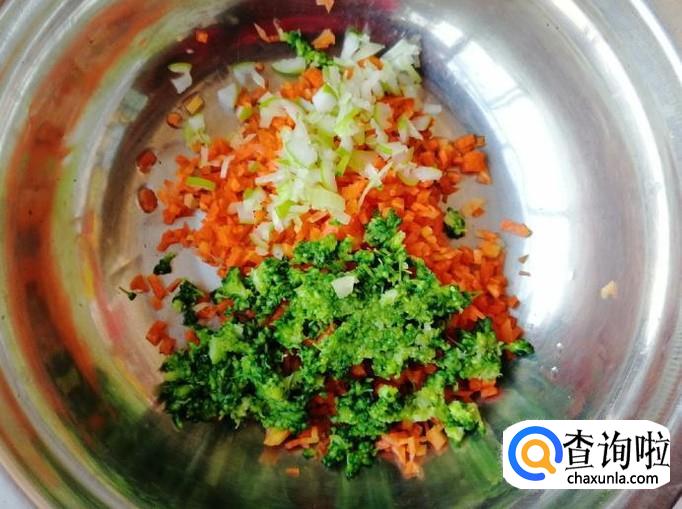 把切好的西兰花末,放入盛胡萝卜末的容器中,加入适量切好的葱末,都放好后准备调味。