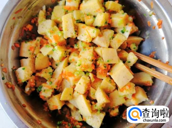 加入适量五香粉,用筷子把所有食材搅拌均匀,然后加入切好的馒头丁,继续搅拌均匀。