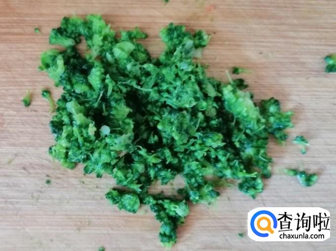 取三四朵熟西兰花的头部,不用杆部分,把西兰花头切成细末待用,选用西兰花头部,主要为了花末更容易沾在馒头丁上。