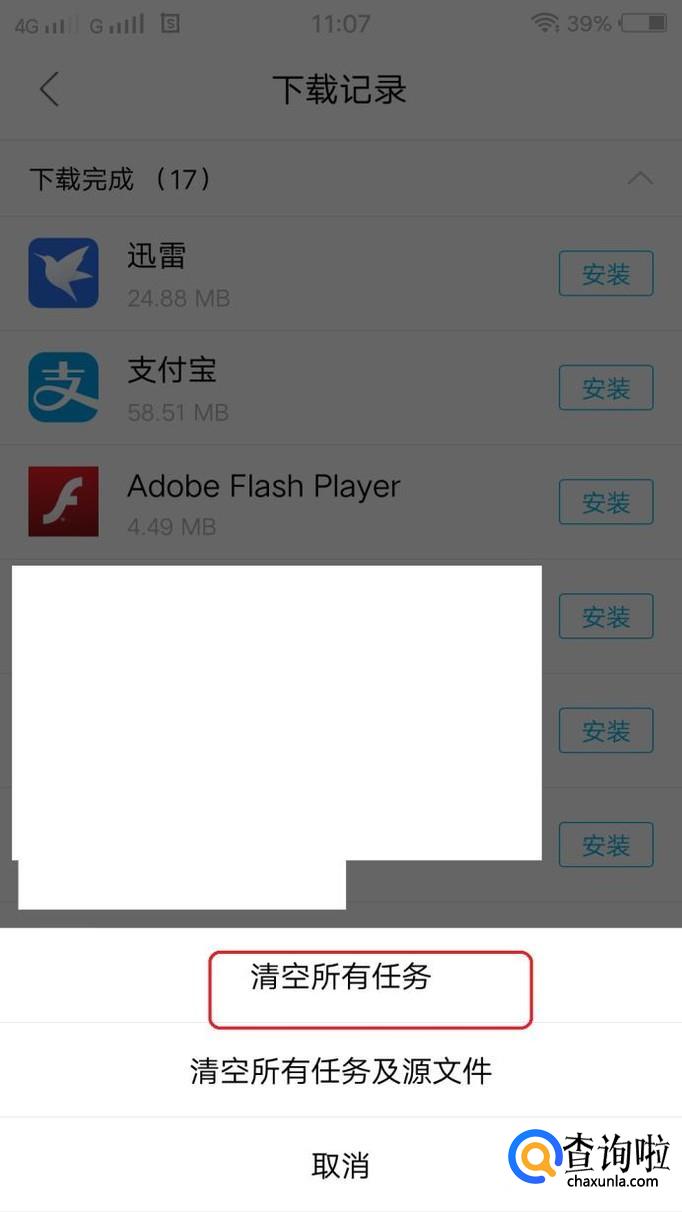 就可以查看在该浏览器中最近的下载记录了,我们点击下方的“清空”按钮,弹出如下选择,我们选择“清空所有任务”。