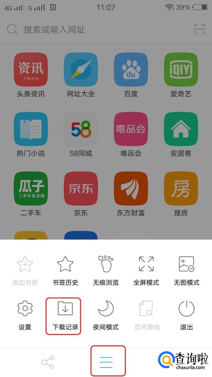 进入浏览器后,如图所示,点击下部图标,会弹出菜单,我们在菜单中点击“下载记录”按钮。