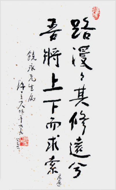 对于在屈原《离骚》中的这句诗,已经成为很多人用以自励的千古名句。有流行解释为:“在追寻真理方面,前方的道路还很漫长,但我将百折不挠,不遗余力地去追求和探索”。实际上,这已经不是此句在原诗中的本来意思了,这是在未看懂全诗时仅对这一句的一种望词生义、自行发挥的理解,虽然豪气,很能启发人的上进之心,但失去了原有的艺术魅力,显得苍白、单调、教条。而且听来会令人感觉到有一股“但求目的,不择手段”的意味。若把本句放回到原诗中,与前后文一起贯通理解,不作断章取义、语录式的随意发挥,便可接触到屈原要向后人表达的完美的艺术内涵,见到一个丰满生动、合情合理的艺术形象。其得益将远远大于仅把它当做一句标语口号来叫喊,也可除去先前解释上的暴戾、固执之气。