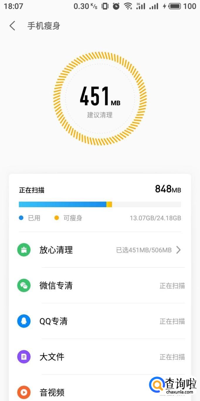 进行一键优化之后点击“手机瘦身”,系统会对手机文件进行深度扫描。