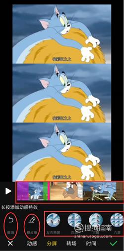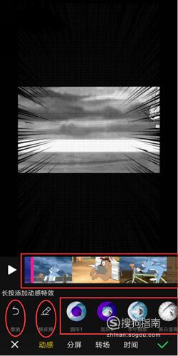 在动感页面可以设置动感特效,拖动进度条找到需要添加特效的场景,长按特效即可添加,长按“橡皮擦”可删除部分操作,点击“撤销”可删除之前操作。