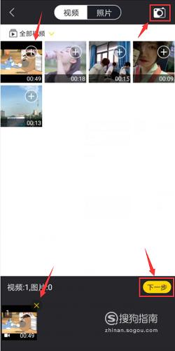 在视频导入页面中,点击“+”导入需要添加特效的视频,点击“×”导出添加错误的视频,当然可以点击“相机”图标现场拍摄。视频导入成功后,点击“下一步”。