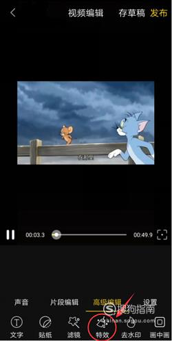 在视频编辑页面下方的菜单栏中,找到“高级编辑”模块的“特效”功能,点击进入下一步骤。