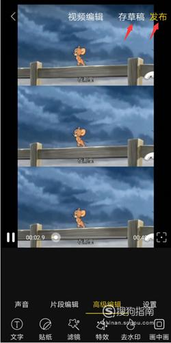 返回视频编辑页面后,点击“存草稿”将视频保存至我的作品,点击“发布”可以快速分享给好友。