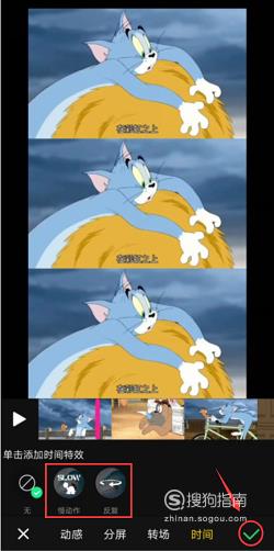 在时间特效设置中,有慢动作和反复两种特效可以设置,点击即可添加。特效设置完成后,点击“√”。