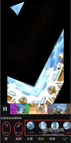 在转场页面可以设置转场特效,如万花筒、左右圆柱、右左圆柱等等,长按添加特效点击“撤销”可删除之前操作,长按“橡皮擦”可删除部分操作。