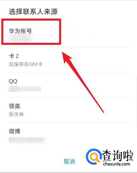 点击后,选择联系人来源,选择华为账号下的联系人。