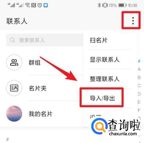 打开华为手机的联系人界面,点击右上方的图标,选择导入/导出。