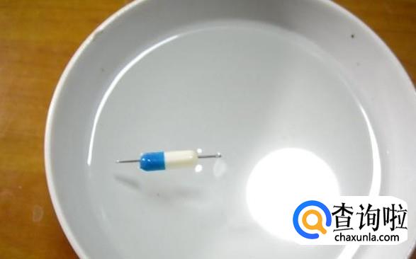 然后把我们的大头针穿过胶囊,放在水里,做成水浮指南,指南针就成功了,这也是很古老的一种方法。