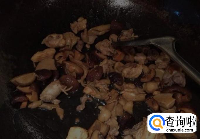 锅中加油,分热时加入辣椒,花椒 姜,老抽,爆炒,加水适量,水开滚时加入干蘑菇,翻炒