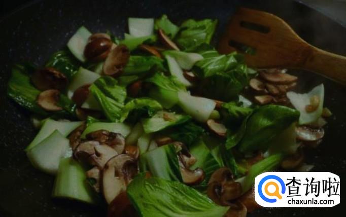 炒到干蘑菇煮涨时,加入小白菜,翻炒,1分钟后,加盐,味精,炒匀,起锅