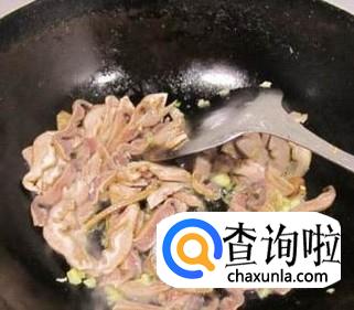 倒入猪肚,大火翻炒,5分钟后,加少许料酒,翻炒,猪肚熟时加入蒜、葱,味精,芹菜起锅。爆炒猪肚就做好了。