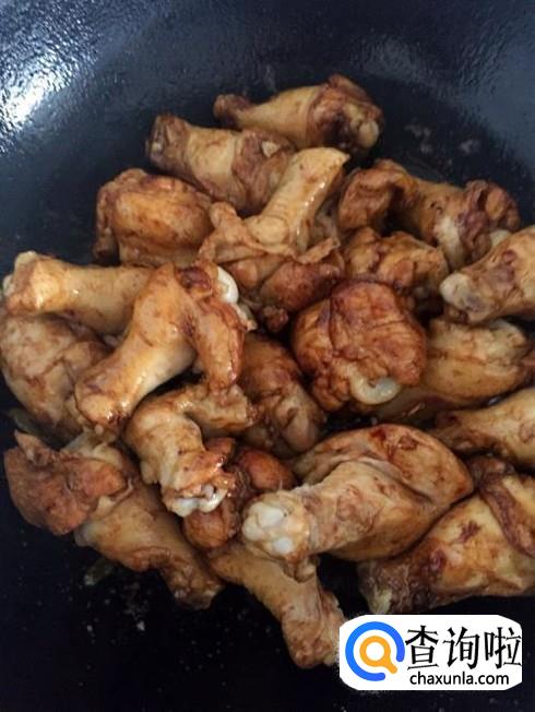 将鸡腿继续翻炒几分钟之后,往锅中加入适量的凉水。