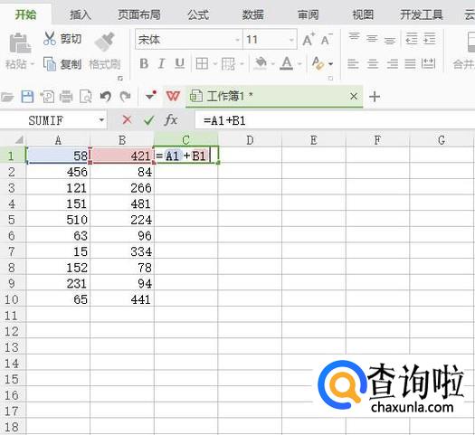 在“C1”单元格中输入“=A1+B1”,此时A1与B1单元格内的数据会分别被不用的颜色所标记。