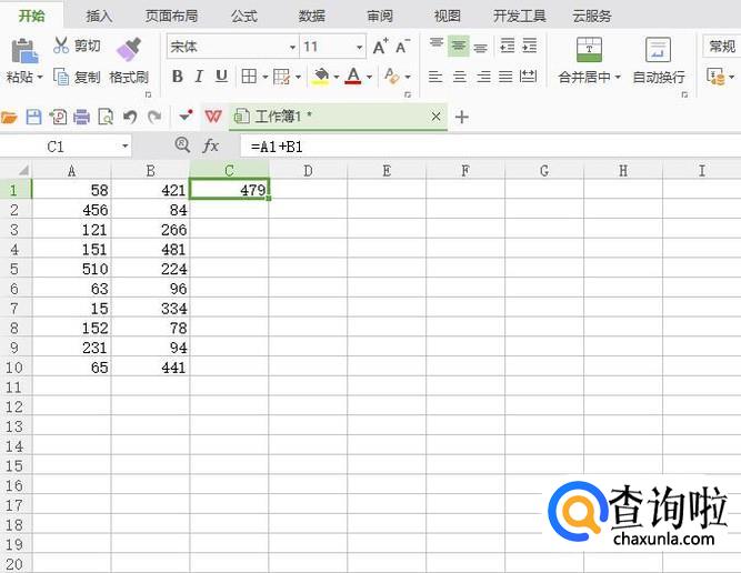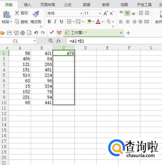 按下“Enter”键,即可在C1单元格中,得到A1与B1单元格内数据进行加法运算后的结果。